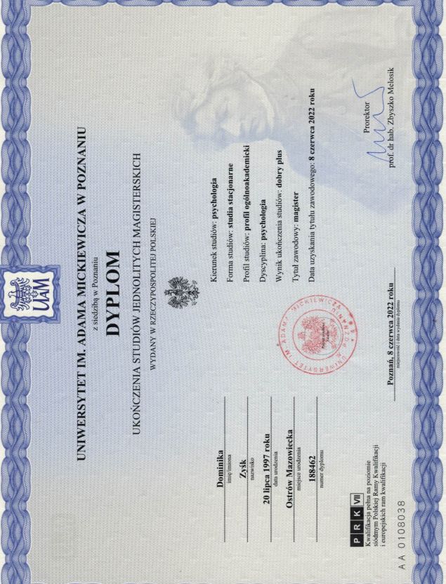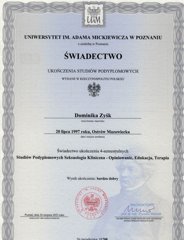 Jestem absolwentką Uniwersytetu im. Adama Mickiewicza w Poznaniu, gdzie uzyskałam tytuł magistra psychologii ze specjalizacją z psychologii klinicznej. Ukończyłam również studia podyplomowe z seksuologii klinicznej na Uniwersytecie im. Adama Mickiewicza. Obecnie kształcę się w czteroletnim kursie psychoterapii poznawczo-behawioralnej w Szkole Psychoterapii Centrum CBT w Warszawie. Program ten jest rekomendowany przez Polskie Towarzystwo Terapii Poznawczej i Behawioralnej (PTTPB) oraz European Association for Behavioural and Cognitive Therapies (EABCT).