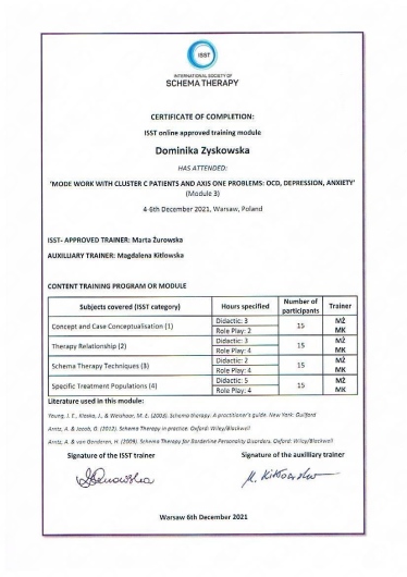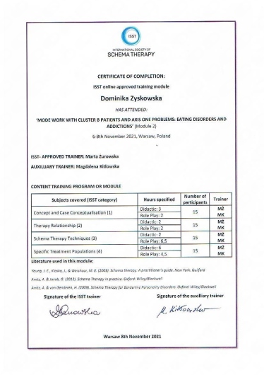 Stale podnoszę swoje kwalifikacje regularnie uczestnicząc w szkoleniach. Swoją pracę poddaję superwizji.