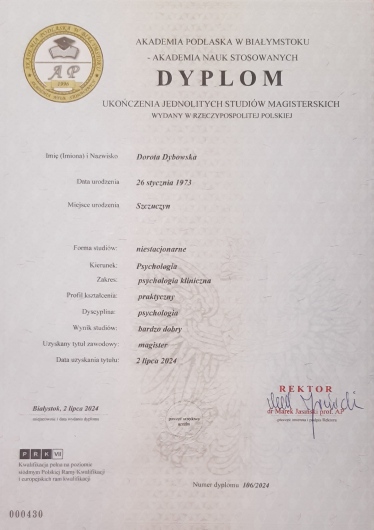 Czy Dorota Dybowska przyjmuje online, bez konieczności pojawiania się w placówce?Tak, Dorota Dybowska oferuje konsultacje online. Wybierz opcję „konsultacja online” przy umawianiu wizyty, a zobaczysz dostępne terminy.