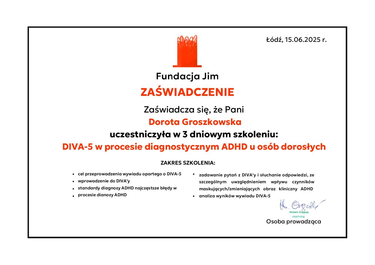 -diagnozę ADHD dla dorosłych (Diva – 5) (180 min)