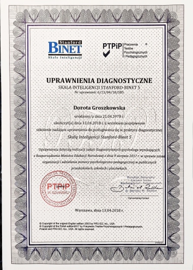 - pełną diagnozę intelektu (m.in Test Stanforda – Bineta, IDS 2) (120 min)