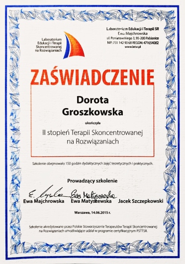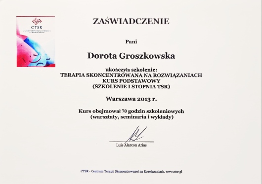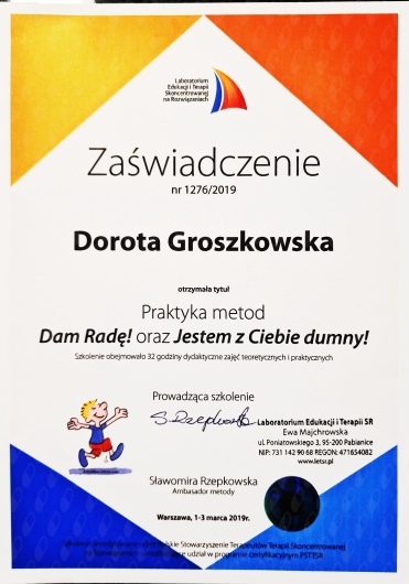 Terapeutycznie pracuję w najbliższym memu sercu podejściu skoncentrowanym na rozwiązaniach (TSR), praktykuję metodę Kids’ Skills – Dam Radę! Korzystam także z bogatego doświadczenia, które przez lata zbierałam, pracując jako psycholog szkolny oraz diagnosta i