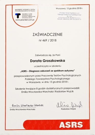 - diagnozę psychologiczną spektrum autyzmu (Zespołu Aspergera) (ASRS)