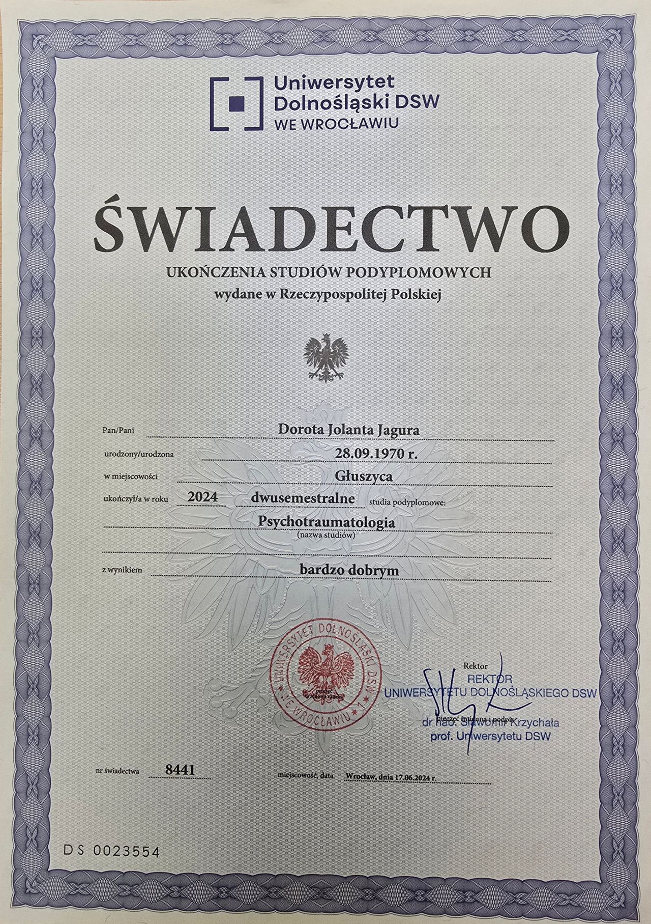 Jestem psychologiem z wykształceniem magisterskim o specjalności psychologia kliniczna, dyplomowanym psychotraumatologiem i psychoterapeutą w trakcie specjalizacji we Wrocławskim Instytucie Psychoterapii w podejściu integracyjnym.