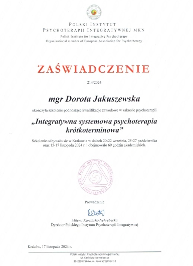 Przez 25 lat pracy, poznałam różne działania i różne perspektywy terapeutyczne, stosuję te, które pomagają. W moim gabinecie jesteś bezpieczna, widziana i słyszana.Najistotniejsze jest to, że staram się pomagać jak najkrócej. Każdy ma inną historię i to jest wg mnie do poznania, zrozumienia i to właśnie decyduje o tym jaką metodą pracujemy.
