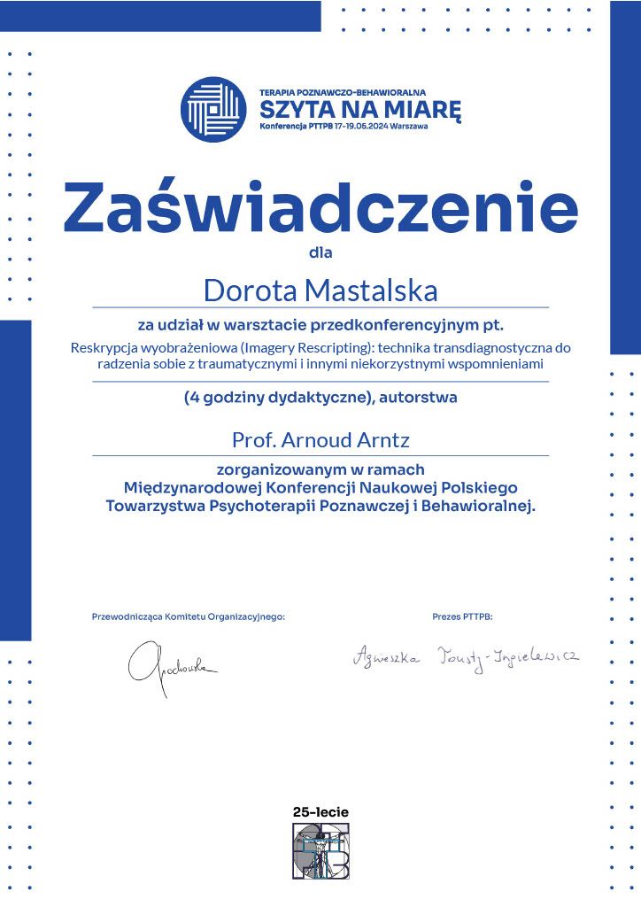 Regularnie poszerzam swoje kompetencje poprzez udział w szkoleniach specjalistycznych oraz konferencjach naukowych. Jestem członkiem Polskiego Towarzystwa Terapii Poznawczej i Behawioralnej, postępuję zgodnie z Kodeksem Etyki stowarzyszenia. Swoją pracę poddaję regularnej superwizji przez certyfikowanego superwizora PTTPB.