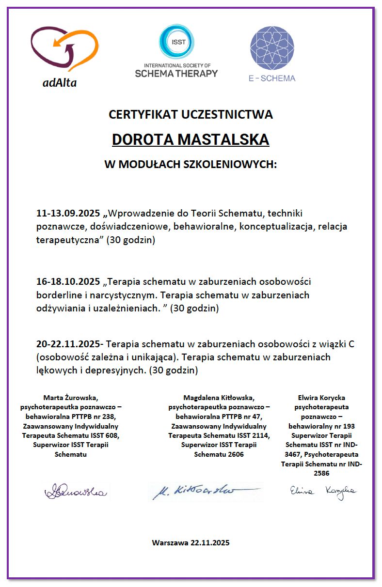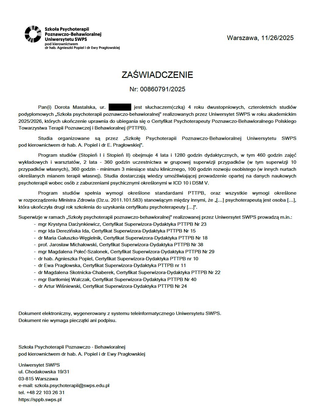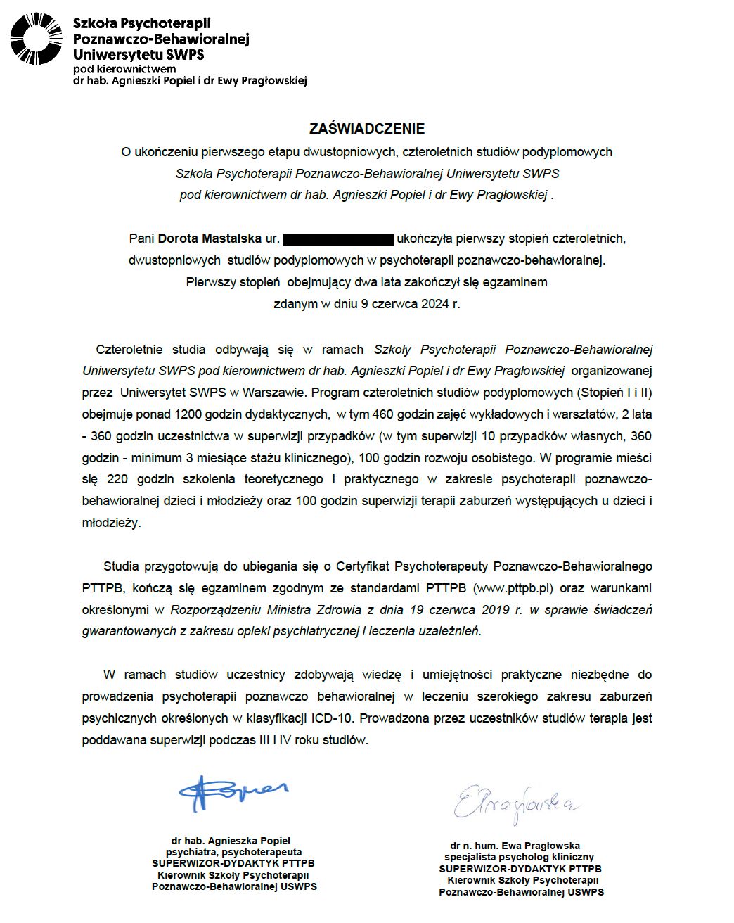 Jestem psychologiem i psychoterapeutką poznawczo-behawioralną w trakcie czwartego roku całościowego szkolenia w Szkole Psychoterapii Poznawczo-Behawioralnej Uniwersytetu SWPS w Warszawie rekomendowanej przez PTTPB. Ukończyłam również szkolenie z Indywidualnej Terapii Schematu akredytowane przez International Society of Schema Therapy (ISST).