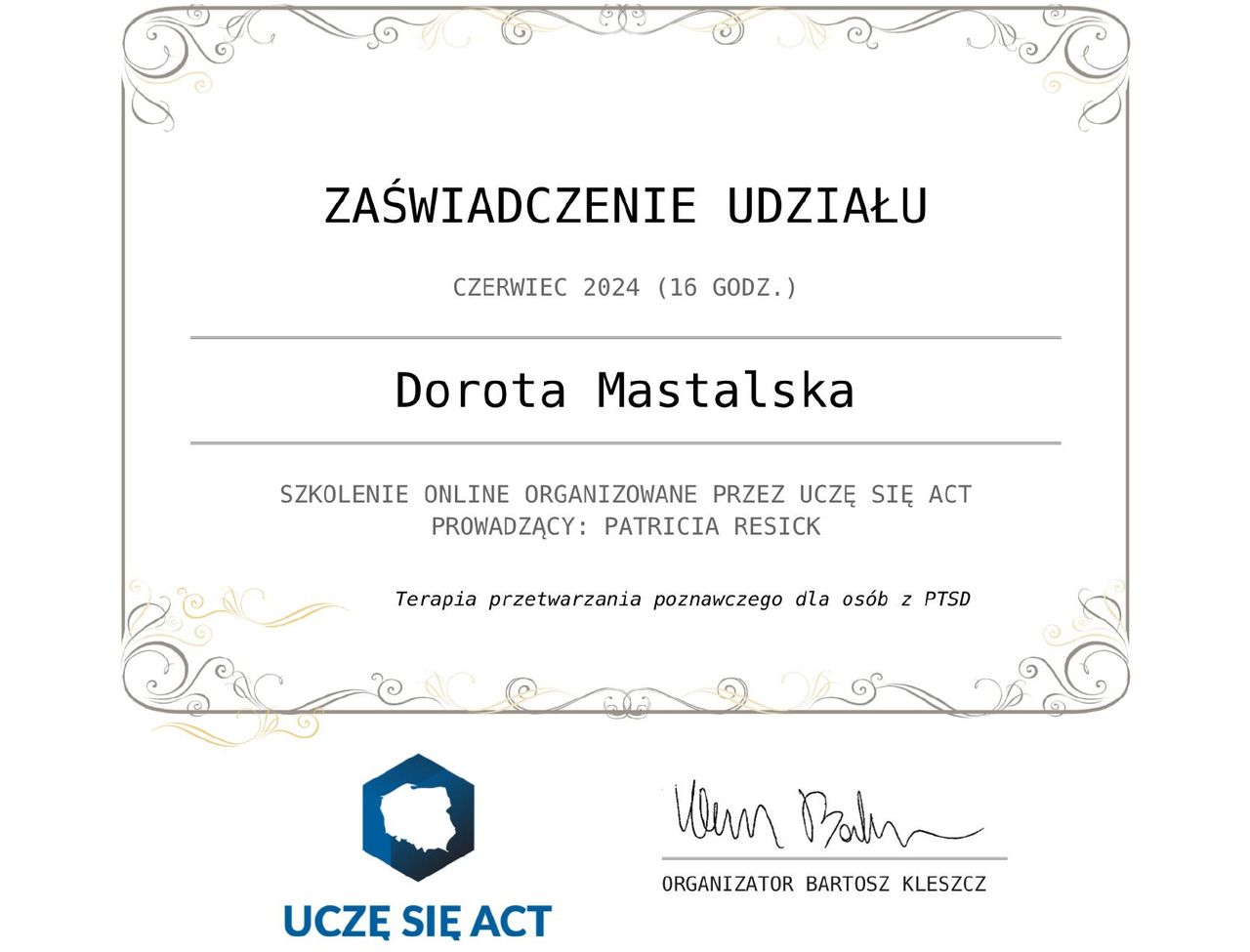 pani Dorota Mastalska jest empatycznym psychoterapeutą. Spotkania były prowadzone w profesjonalny sposób, każdy krok był przemyślany. Terapia poznawczo-behawioralna dała mi narzędzia do radzenia sobie z zamartwianiem się w codziennym życiu. Pani Doroto, bardzo dziękuję za pomoc i wsparcie.• Bezpieczna Przystań - Psychoterapia • Psychoterapia •