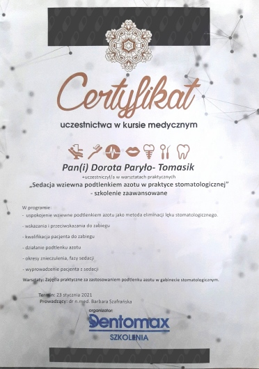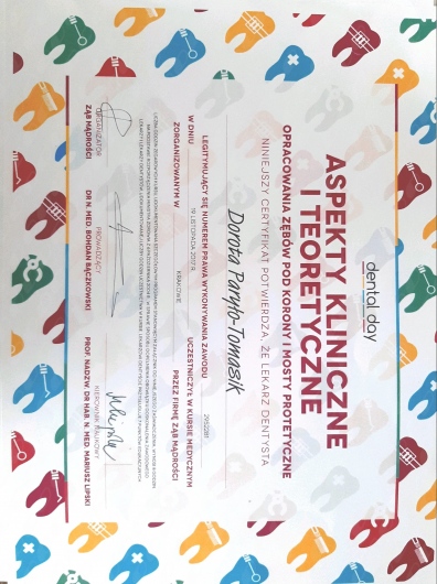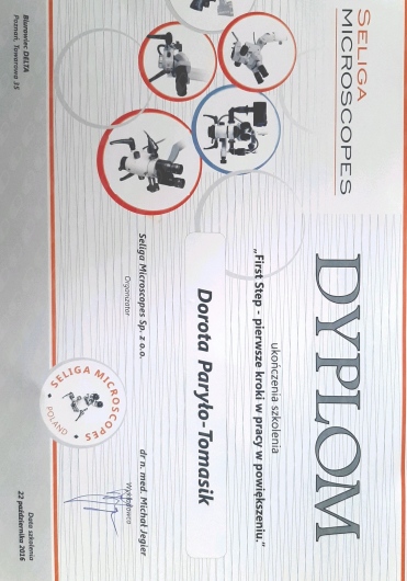Jestem absolwentką Śląskiego Uniwersytetu Medycznego w Katowicach z 2013r. Staż podyplomowy odbyłam w Miejskim Centrum Stomatologii " Podgórze" w Krakowie, gdzie również spędziłam pierwsze lata swojej pracy zawodowej. Uczestniczę w różnych kursach szkoleniowych, aby móc zaoferować swoim Pacjentom najlepsze i najnowsze możliwości lecznicze. Moim celem jest zapewnienie Pacjentom takiej opieki, jaką ja osobiście chciałabym zostać otoczona .