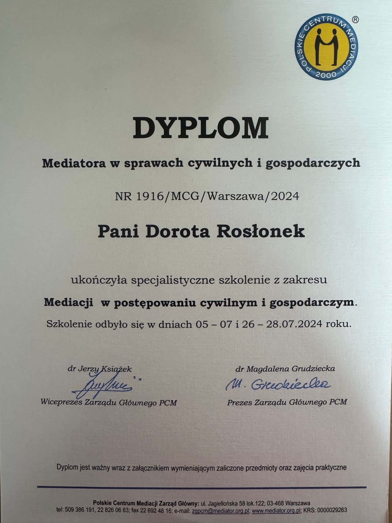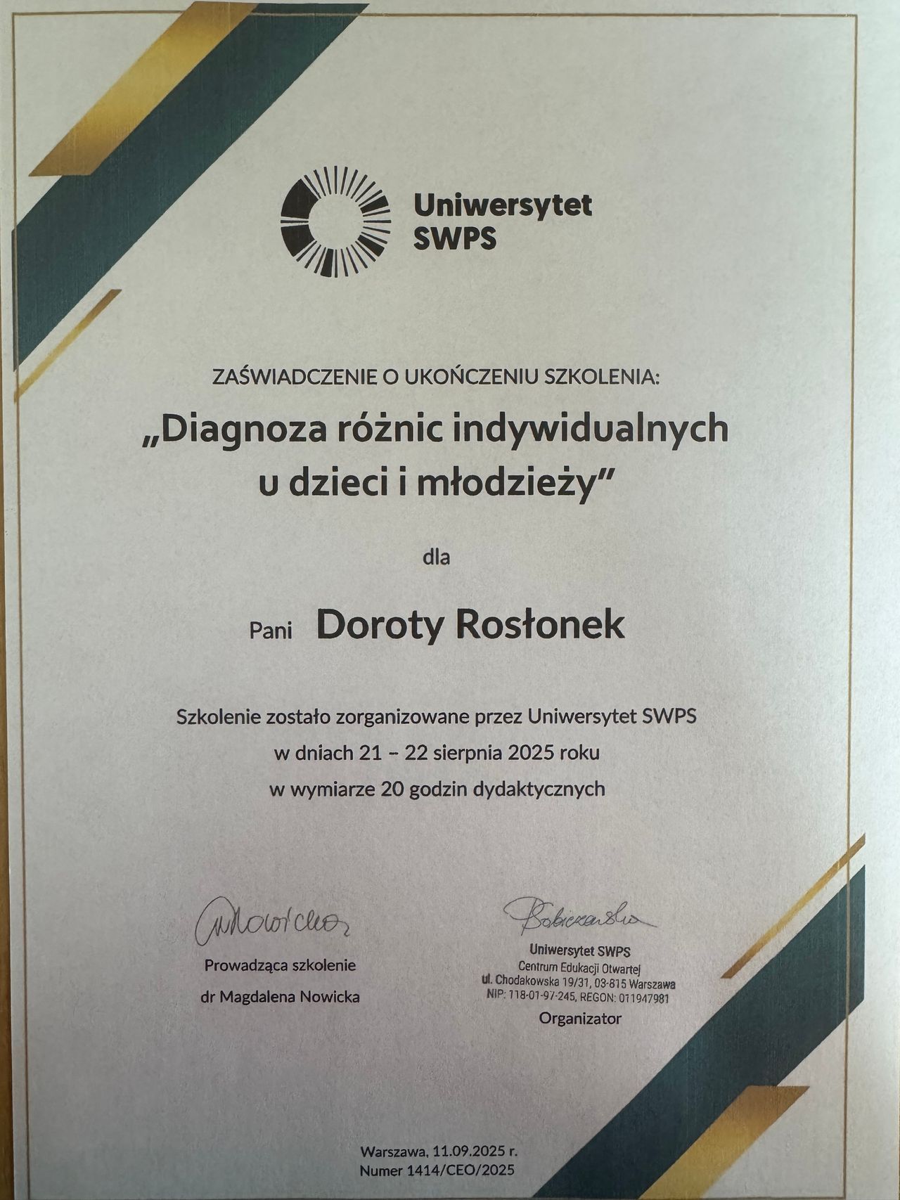 Jestem psychologiem, mediatorem oraz diagnostą, absolwentką studiów magisterskich i podyplomowych na wydziale psychologii Uniwersytetu SWPS. Dodatkowo ukończyłam szkolenie z diagnozy psychologicznej dzieci i młodzieży na Uniwersytecie SWPS oraz szkolenie podstawowe i specjalistyczne z mediacji w Polskim Centrum Mediacji w Warszawie. Aktualnie pogłębiam moją wiedzę i umiejętności w ramach czteroletnich studiów podyplomowych w Szkole Psychoterapii Poznawczo-Behawioralnej SWPS, by jeszcze lepiej odpowiadać na potrzeby moich pacjentów.