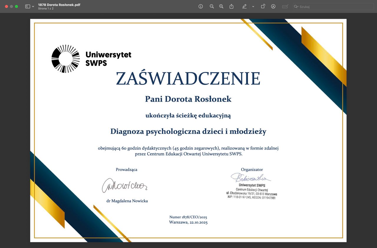 Czy Dorota Rosłonek przyjmuje online, bez konieczności pojawiania się w placówce?Tak, Dorota Rosłonek oferuje konsultacje online. Wybierz opcję „konsultacja online” przy umawianiu wizyty, a zobaczysz dostępne terminy.