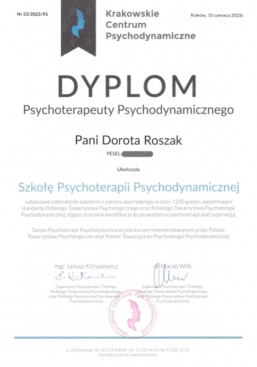 W trosce o jakość swojej pracy i dobro pacjentów regularnie superwizuję swoją pracę u certyfikowanych superwizorów Polskiego Towarzystwa Psychoterapii Psychodynamicznej.