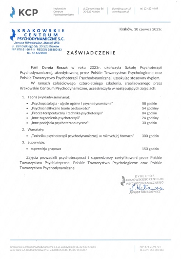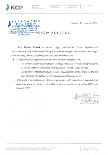 Wiedzę i umiejętności doskonaliłam w Krakowskim Centrum Psychodynamicznym, gdzie ukończyłam całościowe czteroletnie szkolenie rekomendowane przez Polskie Towarzystwo Psychologiczne oraz Polskie Towarzystwo Psychoterapii Psychodynamicznej, którego jestem członkiem.