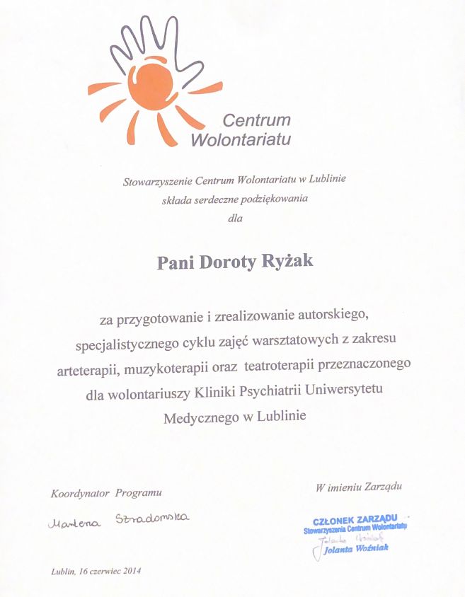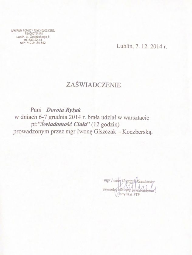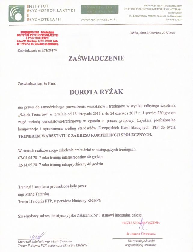 Ukończyłam studia psychologiczne na Katolickim Uniwersytecie Lubelskim z wyróżnieniem. Ukończyłam również Szkołę Trenerów Warsztatu z zakresu kompetencji społecznych i treningu w oparciu o proces grupowy organizowaną przez Stowarzyszenie Natanaelum i Instytut Psychoprofilaktyki i Psychoterapii oraz studia podyplomowe z zakresu Mediacji Sądowej i Pozasądowej, na Katolickim Uniwersytecie Lubelskim. Swoją wiedzę od lat poszerzam uczestnicząc w licznych kursach i warsztatach. Swoją pracę poddaję stałej superwizji.