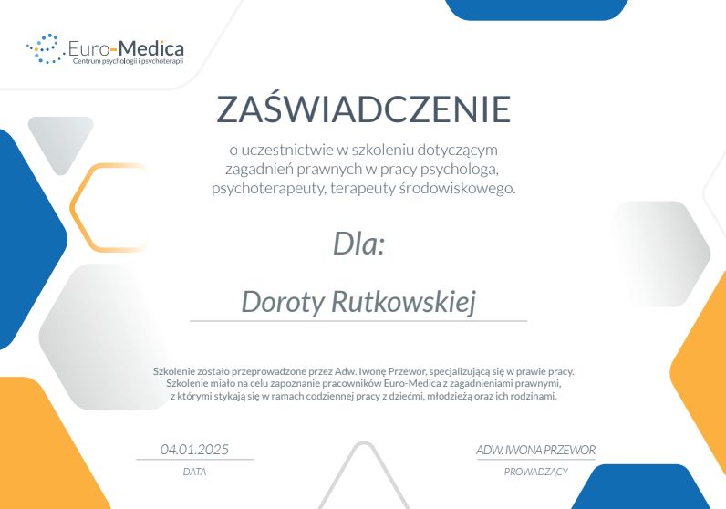 Pani Dorota jest bardzo sympatyczna i konkretna, dzięki czemu łatwo się otworzyć i mówić o trudnych sprawach. Po rozmowie wyszłam z poczuciem, że naprawdę ktoś mnie rozumie i potrafi pokazać inne spojrzenie na problem.