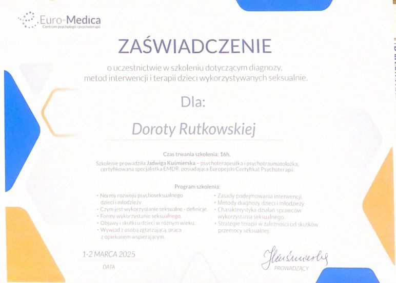 Bardzo dziękujemy za opinię, cieszymy się, że udało się nawiązać pozytywną relację terapeutyczną z Panią Dorotą :) Pozdrawiamy