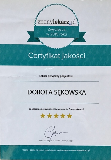 Jak Dorota Sękowska umawia wizyty?Dorota Sękowska używa kalendarza ZnanyLekarz, dlatego na stronie widzisz aktualne terminy. Wystarczy, że wybierzesz datę i godzinę, które odpowiadają Ci najbardziej. Umawianie wizyty jest darmowe, a tuż przed terminem wyślemy Ci przypomnienie.