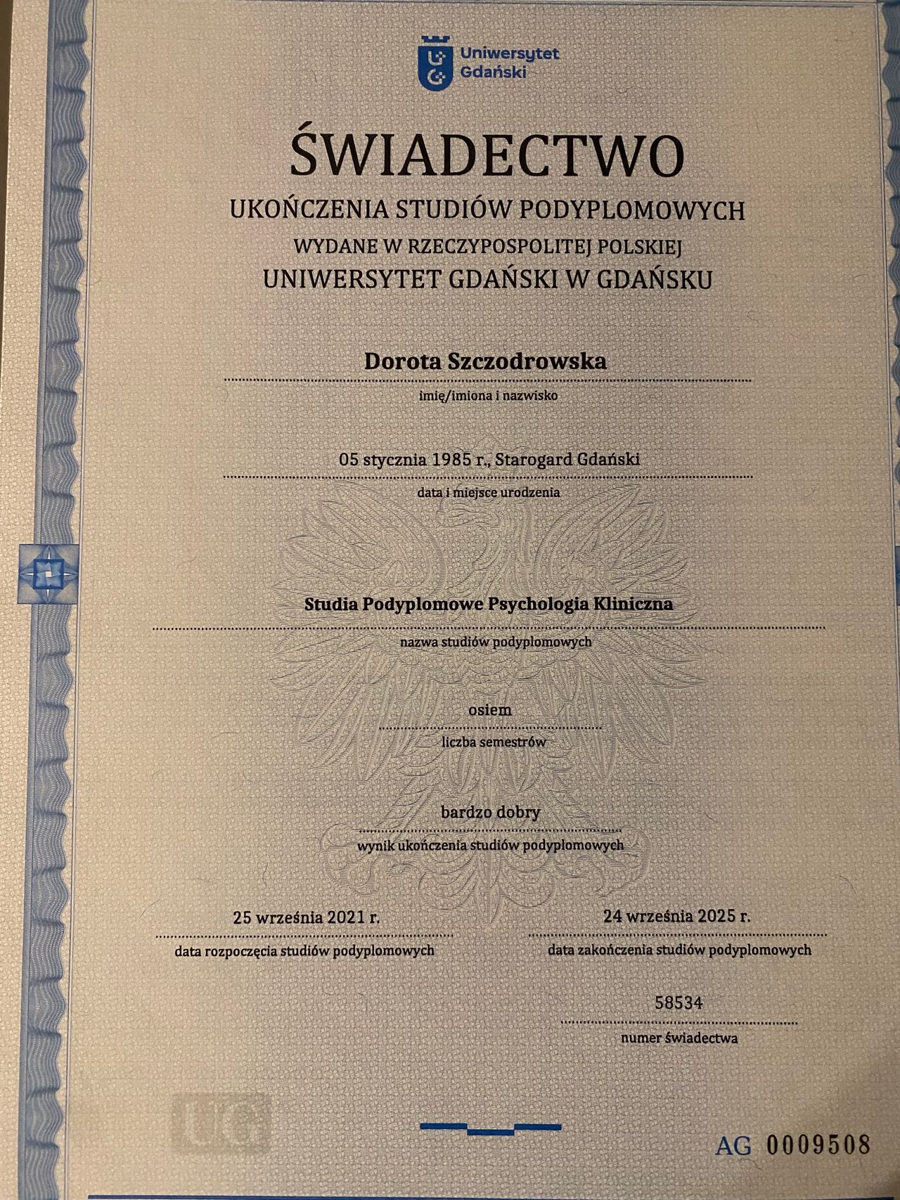 Ukończyłam czteroletnią specjalizację z psychologii klinicznej i obecnie jestem w procesie egzaminacyjnym, przygotowując się do Państwowego Egzaminu Specjalizacyjnego. Równolegle realizuję czteroletnie szkolenie psychoterapeutyczne w nurcie poznawczo-behawioralnym w Szkole Terapii Poznawczo-Behawioralnej Centrum CBT-EDU — placówce rekomendowanej przez Polskie Towarzystwo Terapii Poznawczej i Behawioralnej oraz należącej do European Association for Behavioural and Cognitive Therapies (EABCT).