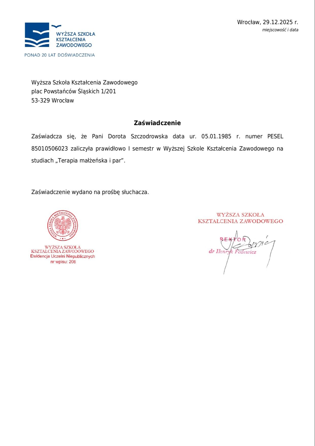 Swoje kompetencje rozwijam również w obszarze terapii par i małżeństw, realizując dwuletnią szkołę podyplomową. Posiadanie szkoleń z obszaru TSR I i II stopnia pozwala mi elastycznie dobierać sposób pracy do indywidualnych potrzeb pacjenta, etapu jego życia oraz złożoności zgłaszanych trudności.