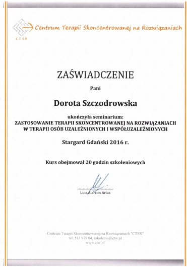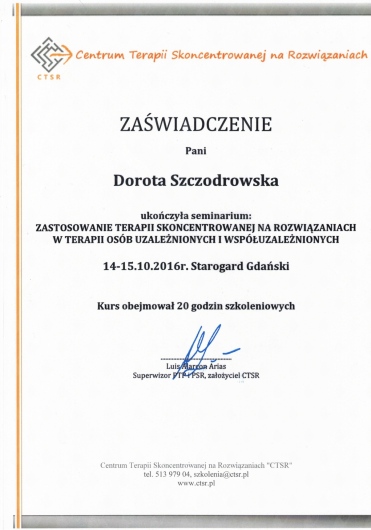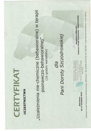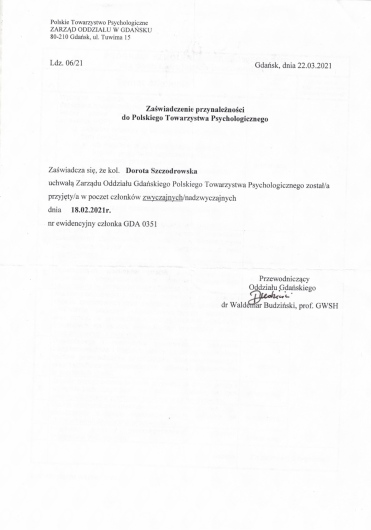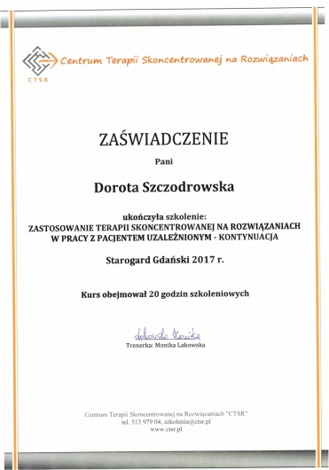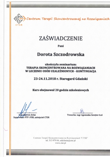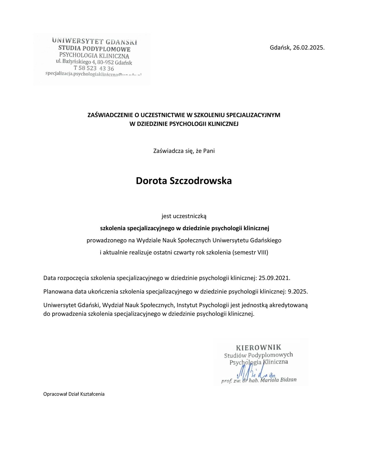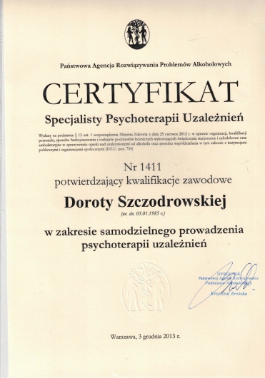 Jestem psycholożką kliniczną i certyfikowaną psychoterapeutką uzależnień z piętnastoletnim doświadczeniem. Kierowałam Poradnią i Oddziałem Dziennym Wojewódzkiego Ośrodka Terapii Uzależnień w Gdańsku. Jestem członkiem Polskiego Towarzystwa Psychologicznego. Swoją pracę poddaję stałej superwizji. Jako psycholog kliniczny po 4 letniej specjalizacji diagnozuję osoby z ADHD. Specjalizuję się w pracy z osobami z rodzin alkoholowych, osobami uzależnionymi, osobami w kryzysie, ADHD i takimi, które nie uzyskały satysfakcjonujących efektów z dotychczasowej terapii.