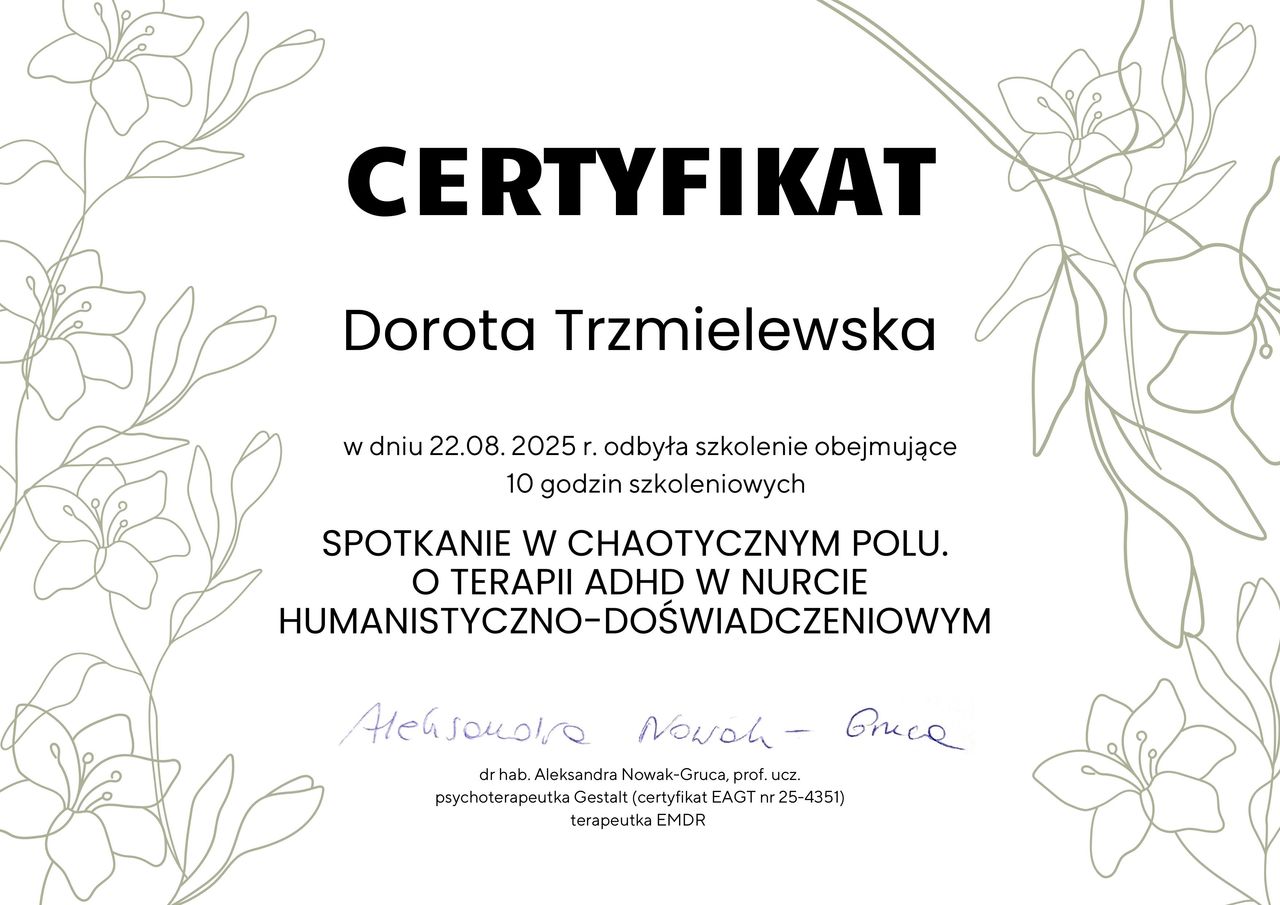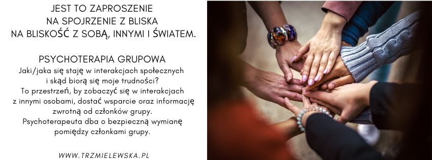 Nazywam się Dorota Trzmielewska, jestem kobietą po 50-stce i psychoterapeutką pracującą w nurcie humanistyczno - egzystencjalnym w ujęciu Gestalt. Zajmuję się psychoterapią osób dorosłych.