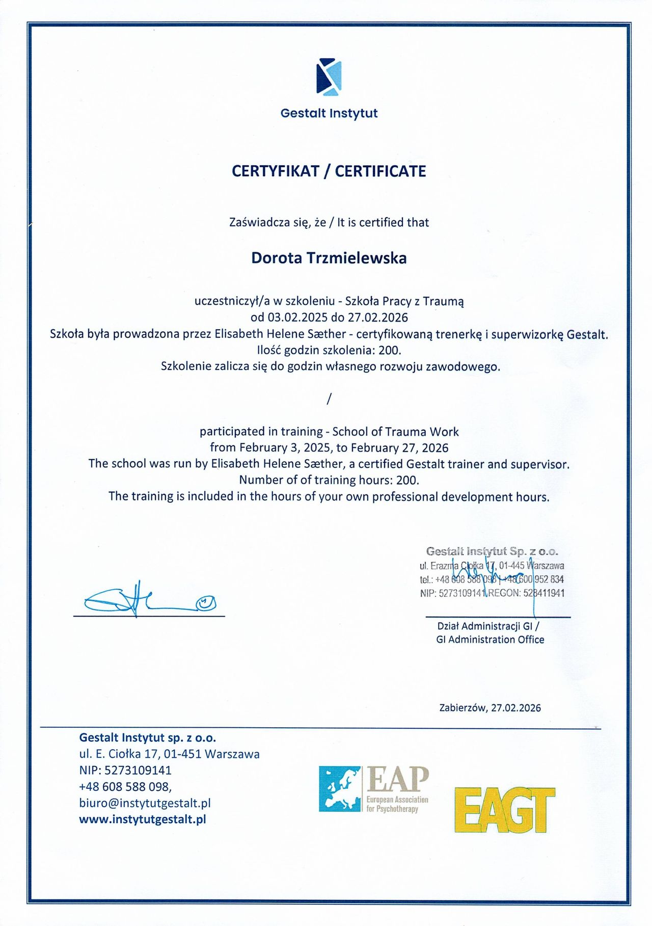 Kwalifikacje psychoterapeutyczne nabyłam w Instytucie Gestalt w Krakowie. W toku szkolenia przeszłam własną psychoterapię szkoleniową oraz trening terapeutyczny grupowy. Regularnie uzupełniam swoją edukację, uczestnicząc w szkoleniach dla profesjonalistów. Pracuję w oparciu o kodeks etyki Europejskiego Stowarzyszenia Terapii Gestalt (EAGT). Pracuję zgodnie ze standardami ogólnoświatowej organizacji reprezentującej środowisko coachów International Coach Federation (ICF). Systematycznie uczęszczam na superwizję indywidualną z Bartłomiejem Żukowskim oraz na superwizję grupową z Bogdanem Korzeń.