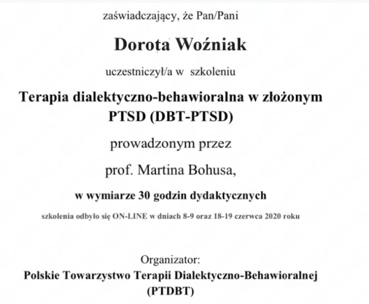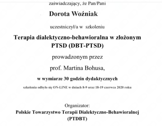 Z wykształcenia jestem psychologiem, pedagogiem i oligofrenopedagogiem. Ponadto psychoterapeutą w nurcie behawioralno- poznawczym i terapii schematów. Jestem terapeutą DBT i ACT oraz Terapii Skoncentrowanej na Emocjach. Posiadam też licencjat z neurobiologii. Moje dodatkowe specjalizacje to psychotraumatologia, neuropsychologia, psychologia kliniczna, poznawcza, społeczna oraz psychologia transportu. Pracuję m.in. jako nauczyciel akademicki na Wydziale Psychologii w Warszawie i przekazuję swoją wiedzę z zakresu neuropsychologii, mózgowych mechanizmów funkcji poznawczych, psychopatologii, a także psychologii zwierząt. Bardzo lubię kontakt ze studentami, gdyż dostarcza mi on nieustannej motywacji do ciągłego zdobywania wiedzy, nowych i wyjątkowych rozwiązań oraz pomysłów, które wykorzystuje w pracy gabinetowej i działalności naukowej. Prowadzę także szkolenia oraz warsztaty skierowane do osób i organizacji pragnących rozwijać swoje umiejętności w zakresie zarządzania, komunikacji, rozwiązywania konfliktów oraz budowania efektywnych zespołów. W kręgu moich zainteresowań jest neuropsychologia i w tym kierunku podjęłam studia doktoranckie. Moje ponad 10 - letnie doświadczenie zdobywałam przede wszystkim w pracy gabinetowej, jak również współpracując z placówkami, do których po pomoc zgłaszali się pacjenci w kryzysach psychicznych.