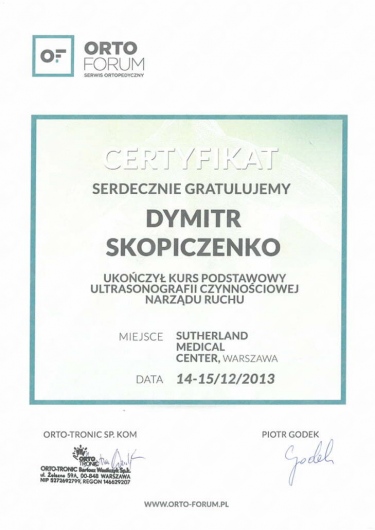 Posiada duże doświadczenie w zakresie diagnostyki obrazowej USG które nabył podczas wielu kursów i szkoleń organizowanych w Sutherland Clinic w Warszawie w zakresie terapii z użyciem Ortokine , kriolezji, ozonoterapii oraz blokad parovertebralnych .