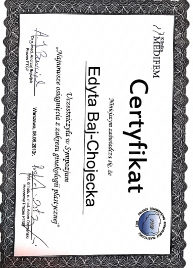 Nazywam się Edyta Baj-Chojecka – jestem specjalistą położnictwa i ginekologii z ponad dwudziestoletnim doświadczeniem klinicznym zdobywanym w najbardziej prestiżowych warszawskich ośrodkach medycznych. Dyplom lekarza otrzymałam w 2002 roku, na I Wydziale Lekarskim Akademii Medycznej w Warszawie.