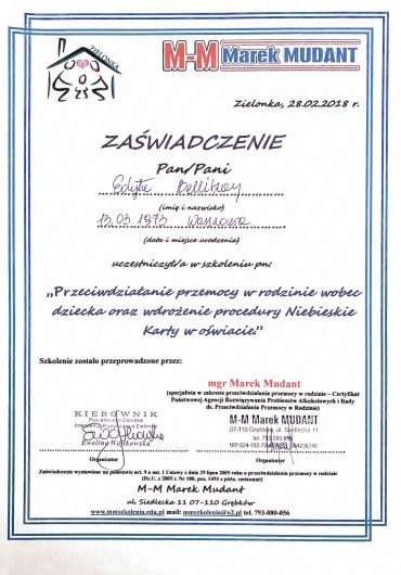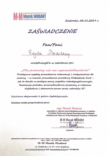 Nieustannie podnoszę swoje kwalifikacje przez udział w licznych szkoleniach, kongresach psychologiczno-psychoterapeutycznych.