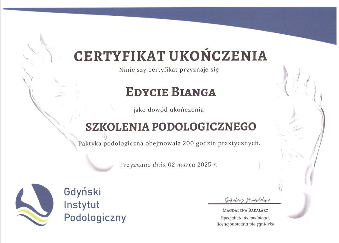 Jaki jest zakres porad oferowanych przez Edyta Bianga?Edyta Bianga to podolog. Na podstawie swojego doświadczenia i wykształcenia Edyta Bianga oferuje usługi takie jak: Konsultacja podologiczna, Kompleksowa usługa podologiczna, zabieg podologiczny, badania bakteriologiczne, Badanie mykologiczne, Usuwanie brodawek (kurzajek), Leczenie wrastającego paznokcia, Leczenie wrastających paznokci.