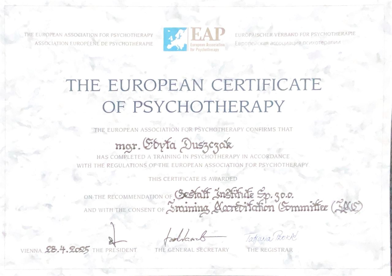 Jestem certyfikowana psychoterapeutką Gestalt (EAGT No 22-0306) oraz EAP(European Associaton for Psychotherapy) ,trenerką oraz superwizorką w trakcie certyfikacji. Ukończyłam Szkołę Trenerów i Psychoterapeutów w Instytucie Terapii Gestalt w Krakowie. Aktualnie uczestniczę w Szkole Superwizorów organizowanej przez Szkolenia Gestalt w Krakowie a prowadzonej przez Carmen Vazquez Bandin z Centro de Terapia y Psicologia (CTP) w Madrycie Posiadam certyfikat Specjalistki przeciwdziałania przemocy w rodzinie (nr.117) Instytutu Psychologii Zdrowia w Warszawie. Od wielu lat prowadzę psychoterapie, szkolenia oraz warsztaty rozwoju osobistego. Aktualnie pracuje w Gestalt Instytut w Krakowie. W trakcie sesji terapeutycznych będziesz mieć możliwość poszukiwania i autentycznego wyrażania siebie w atmosferze bezpieczeństwa i zaufania. Swoją pracę systematycznie superwizuję, spełniającym międzynarodowe standardy szkoleniowe. Specjalizuję się w: - psychoterapii indywidualnej - interwencji w kryzysie - psychoterapii grupowej, szkoleniach, warsztatach, treningach rozwoju osobistego Zapraszam do odwiedzenia strony internetowej