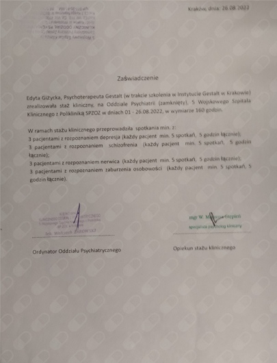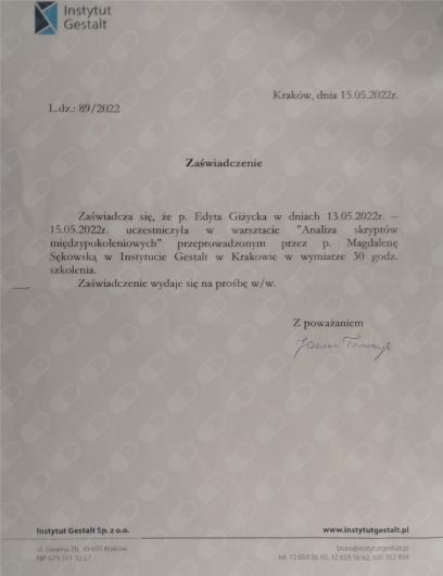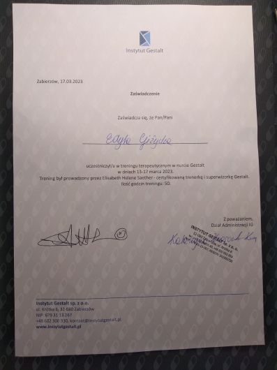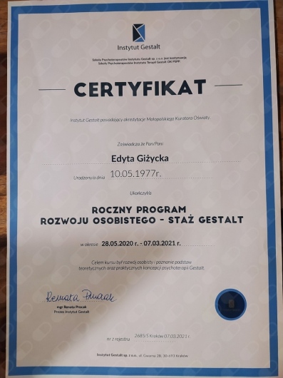 Jestem psychoterapeutką Gestalt. Ukończyłam akredytowaną przez EAGT/EAP, Gestalt Instytut sp. zo.o. w Krakowie (czteroletnią Szkołę Psychoterapeutów Gestalt (624 h) i obecnie jako Psychoterapeutka w trakcie szkolenia kontynuuję rozwój w ramach Procesu Poszkoleniowego prowadzący do certyfikacji.