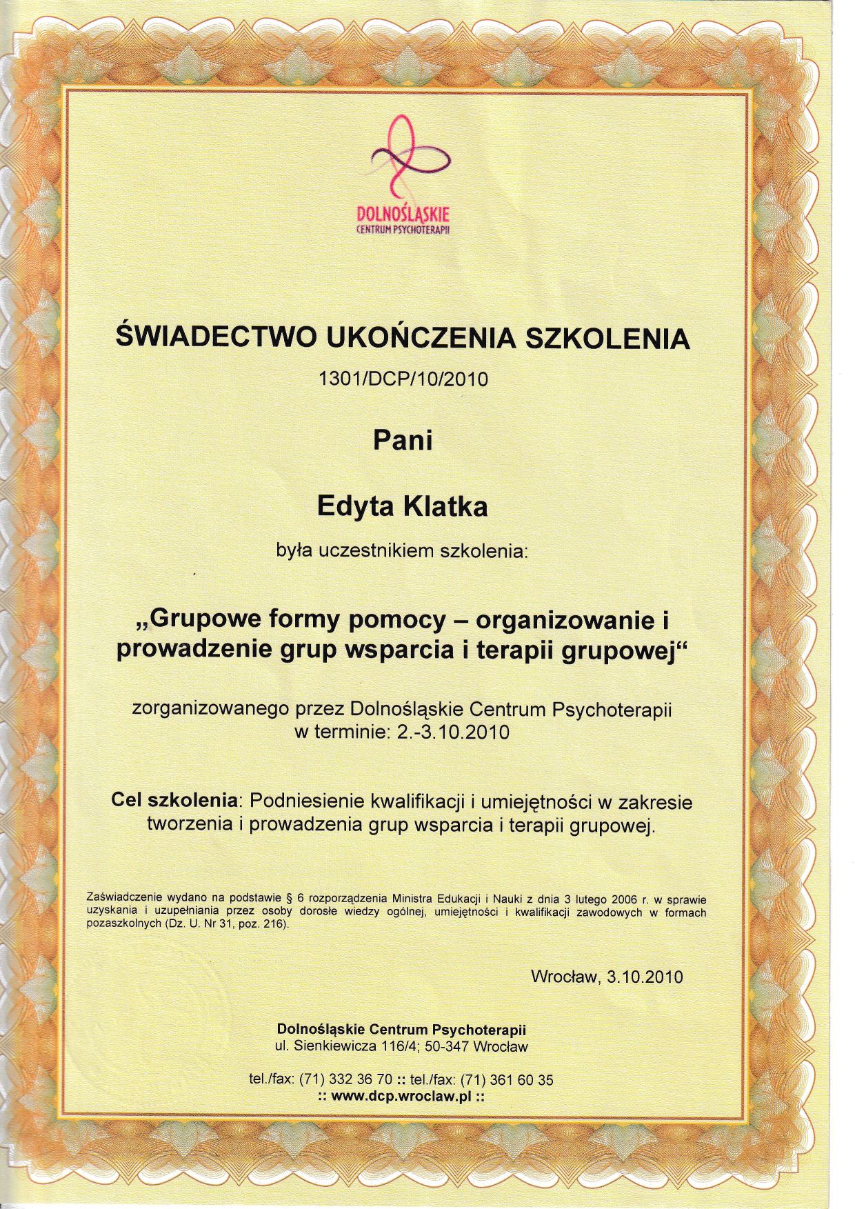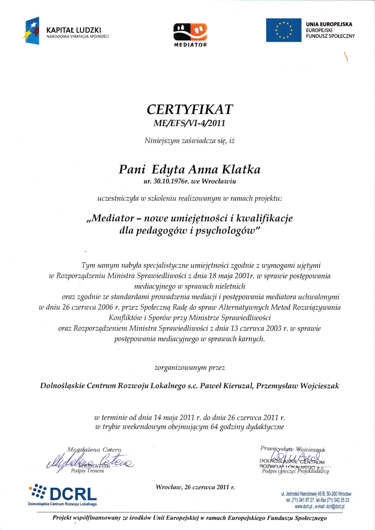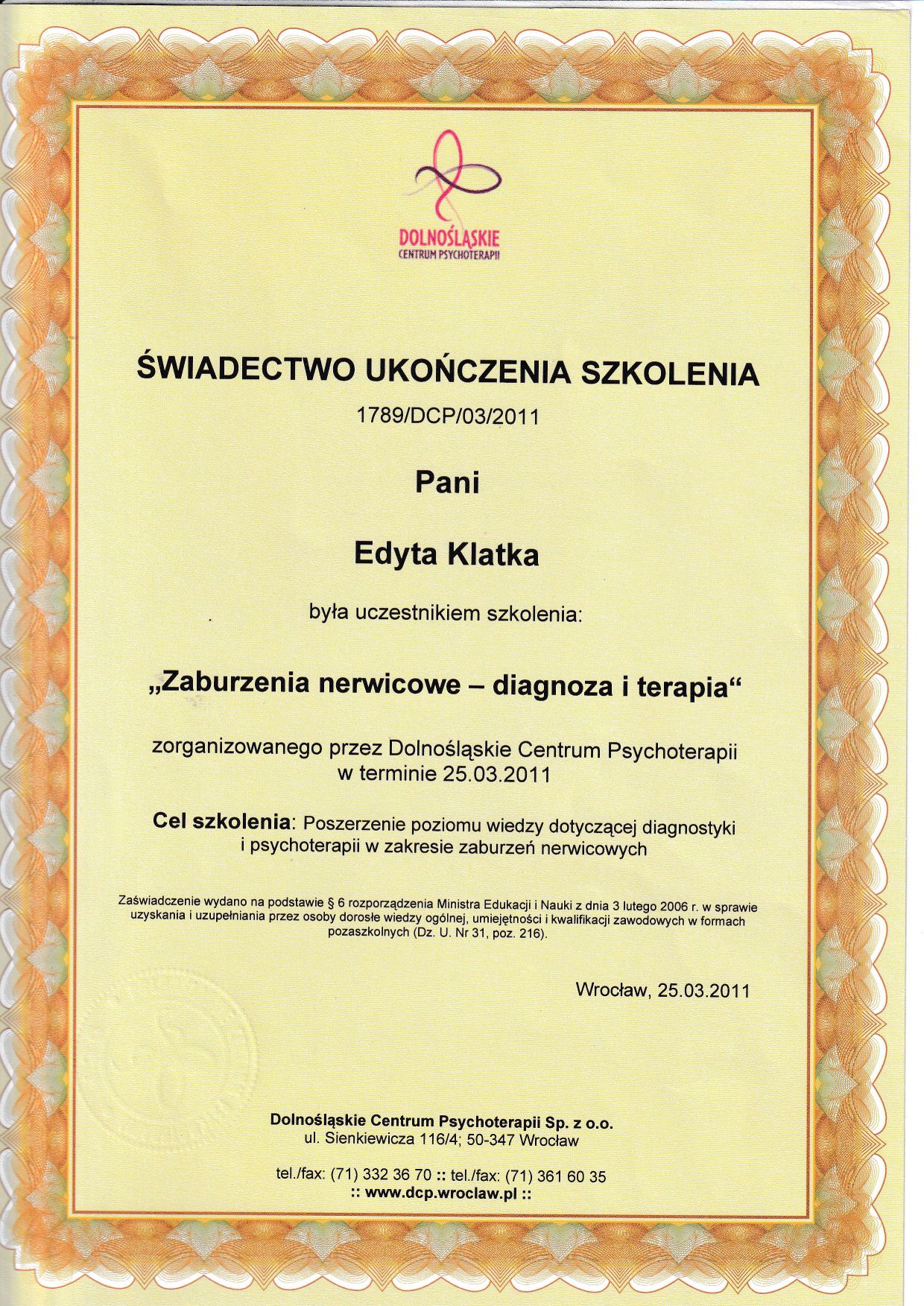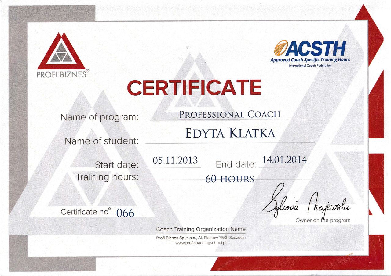 Witaj na moim profilu. Jestem psychologiem z ponad 17 letnim stażem pracy w zawodzie. W 2004 roku otrzymałam dyplom magistra psychologii na Uniwersytecie Wrocławskim z oceną bardzo dobrą. Dodatkowo posiadam certyfikat Coacha ICF, Mediatora, ukończyłam dwuletnią szkołę psychoterapii systemowej WTTS (I stopień) stale rozwijam się z dziedziny psychologii i psychoterapii.