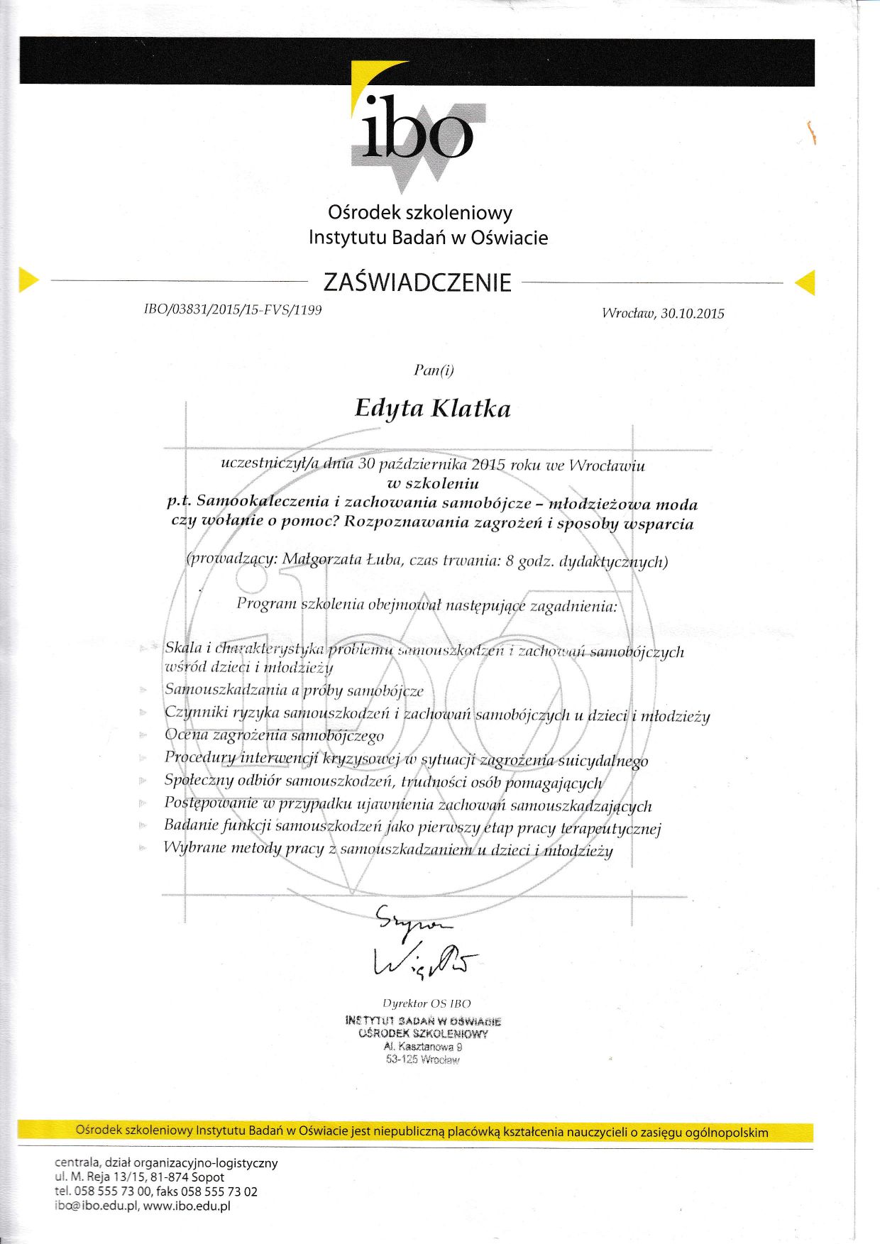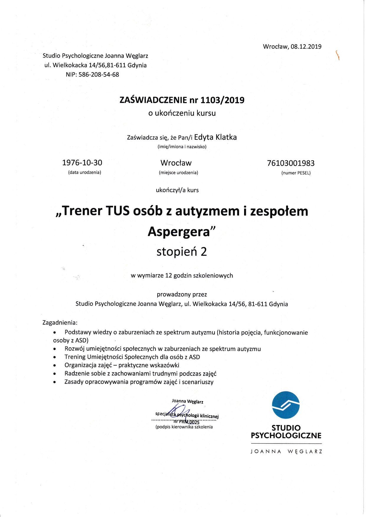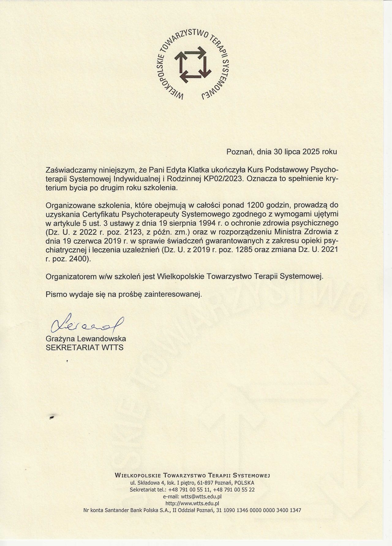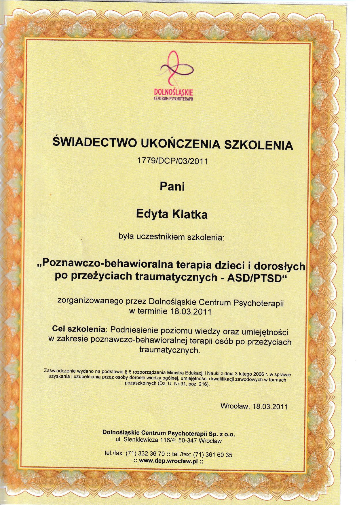 Witaj na moim profilu. Jestem psychologiem z ponad 17 letnim stażem pracy w zawodzie. W 2004 roku otrzymałam dyplom magistra psychologii na Uniwersytecie Wrocławskim z oceną bardzo dobrą. Dodatkowo posiadam certyfikat Coacha ICF, Mediatora, ukończyłam dwuletnią szkołę psychoterapii systemowej WTTS (I stopień) stale rozwijam się z dziedziny psychologii i psychoterapii.