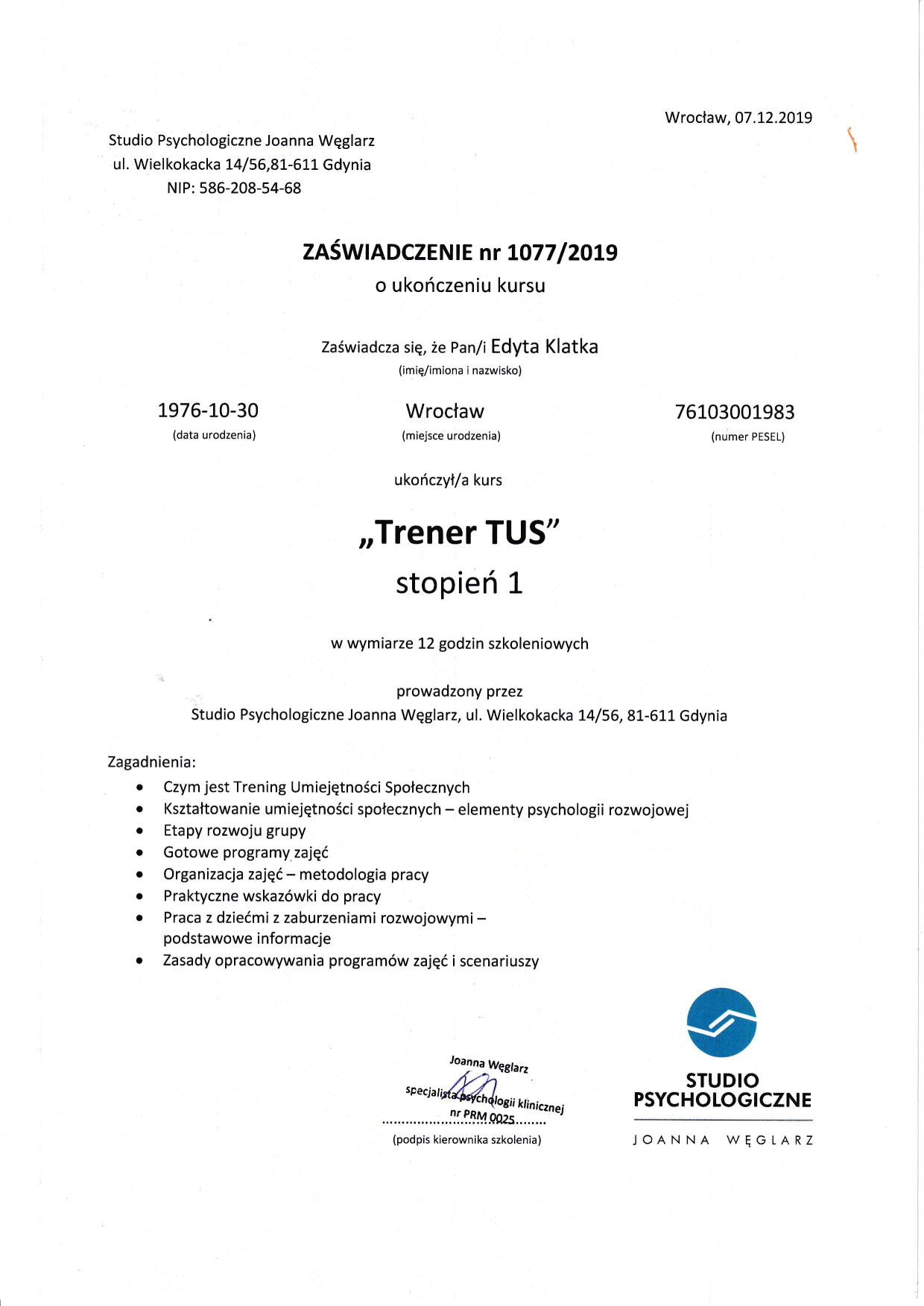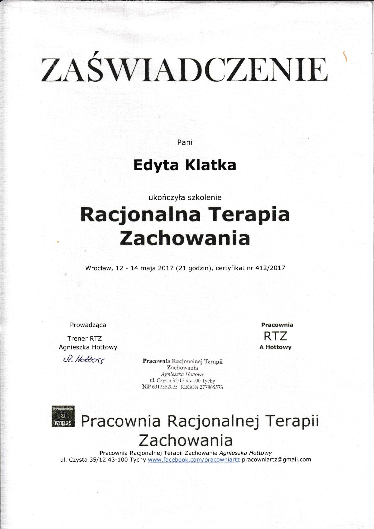 • Pracownia Rozwoju Osobistego - Edyta Klatka • konsultacja psychologiczna (kolejna wizyta) •