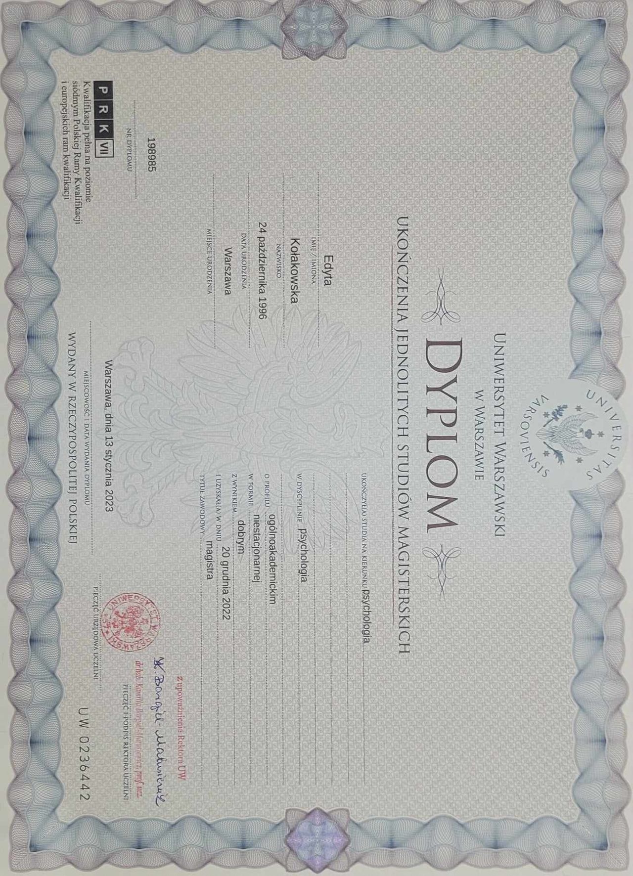 Ukończyłam psychologię na Uniwersytecie Warszawskim, realizując specjalizację psychologii klinicznej dziecka i rodziny. Dodatkowo przeszłam 9 miesięczny, praktyczny kurs interwencji kryzysowej w Instytucje Terapii Poznawczo-Behawioralnej we Wrocławiu. Mogłam tam poszerzyć wiedzę o tym, jak wspierać młodzież i dorosłych doświadczających najróżniejszych kryzysów, m.in. związanych z żałobą i stratą, doświadczeniem przemocy, w kryzysem utraty zdrowia, zagrożenia samobójczego.