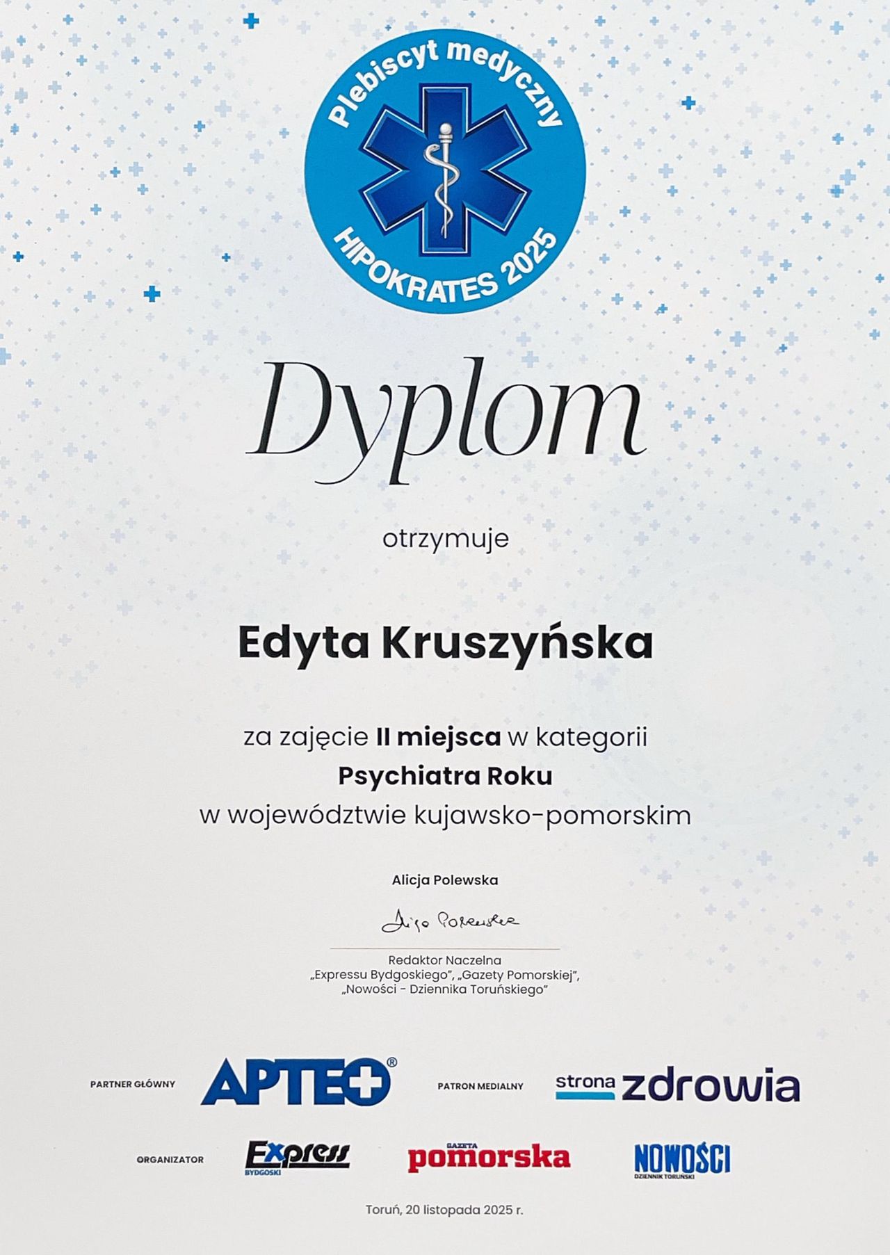 Laureatka 2 miejsca w konkursie wojewódzkim Hipokrates 2025 w kategorii Psychiatra Roku.