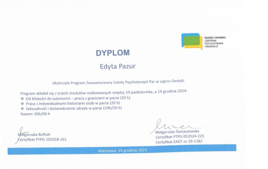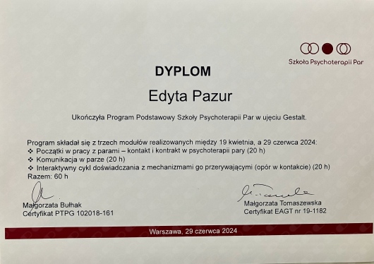 Polecamy Panią Edytę jako terapeutkę par. Od pierwszej wizyty czuliśmy się wysłuchani, zrozumiani i otoczeni prawdziwą troską. Pani Edyta tworzy atmosferę pełną akceptacji i bezpieczeństwa, dzięki czemu rozmowy, nawet na trudne tematy, są konstruktywne i owocne. Pomogła nam spojrzeć na nasz związek z nowej perspektywy, nauczyła skutecznej komunikacji i dała narzędzia do budowania silniejszej, bardziej świadomej relacji. Jesteśmy ogromnie wdzięczni za wsparcie i profesjonalizm.