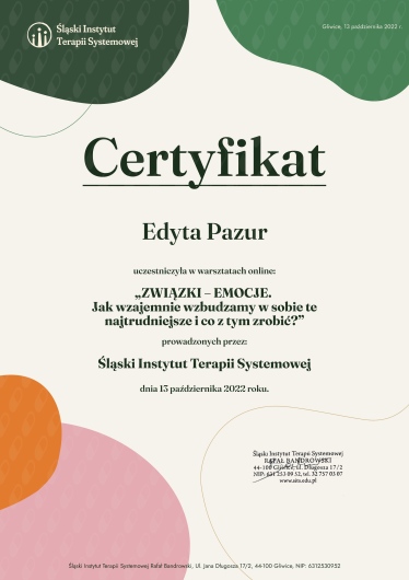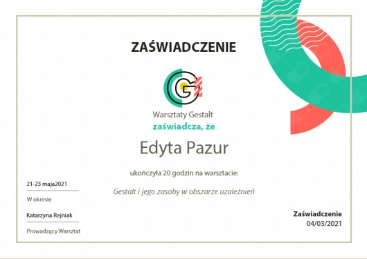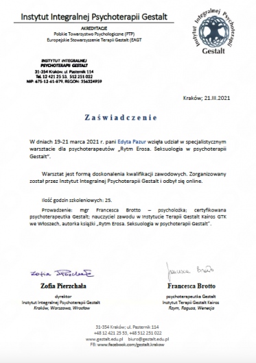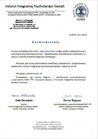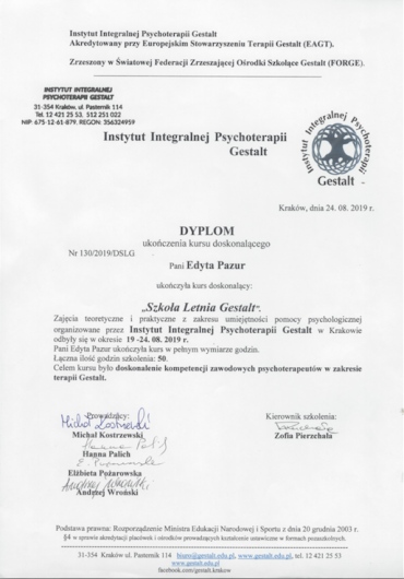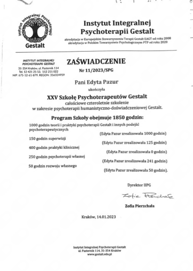 Swoją wiedzę zdobywałam na licznych specjalistycznych szkoleniach oraz w całościowym 4-letnim szkoleniu psychoterapeutycznym Instytucie Integralnej Psychoterapii Gestalt w Krakowie.