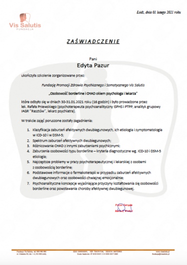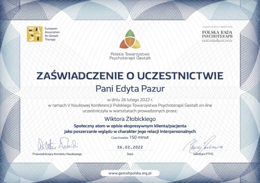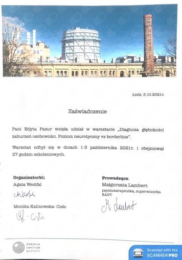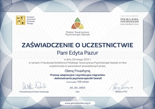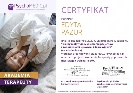 Szkolenia: "Szkoła Psychoterapii Par w Ujęciu Gestalt"- Dobre Więzi , "Szkoła Psychoterapii Par" -etap zaawansowany -Razem i Osobno, "Jak w praktyce prowadzić sesje z narcystyczną parą"- dr B.Zalewski, "Związki i emocje. Jak wzajemnie wzbudzamy te najtrudniejsze i co z tym zrobić"- Śląski Instytut Terapii Systemowej, "Trzecia osoba w związku. Terapia par z problemem seksu pozamałżeńskiego"- prof. Skowroński, ''Psychoterapia Pacjentów z zaburzeniami regulacji emocjonalnej. Perspektywa koncepcji przywiązania i mentalizacji''- prof. dr hab. Barbara Józefik, "Pierwsze spotkanie z parą, zalecenia dla specjalistów i rozwiązania dla najczęstszych dylematów" -dr B.Zalewski, "Seksuologia kliniczna dysfunkcje seksualne w terapii Gestalt"- Francesca Brotto (IIPG),"Doświadczenie korektywne" - Dorota Węgrzyn (IIPG), "Proces grupowy"- Kamila Kostrzewska, "Neurobiologia Przywiązania", "Osobowość Borderline i CHAD okiem psychologa i lekarza" Rafał Pniewski, "Psychoterapia zaburzeń osobowości w ujęciu trans-kulturowej psychologii pozytywnej", "Osobowość z trzech perspektyw: psychologii klinicznej, psychiatrii i psychoterapii"( podejście pozytywne i psychodynamiczne)- Gabiriela Hum.