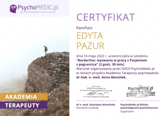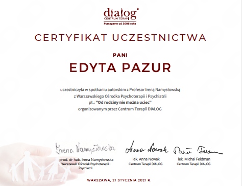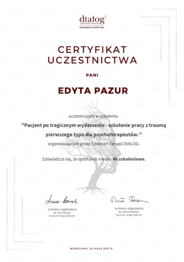 Pani Edyta jest z pewnością godnym polecenia terapeutą. Prowadzi spotkania w sposób rzeczowy i profesjonalny, a jednocześnie bardzo empatyczny. Potrafi wzbudzić zaufanie przyjazną atmosferą, co nie przeszkadza jasno określać granic i zasad współpracy, kiedy jest to potrzebne. Moje osobiste doświadczenie pokazuje również, że stosowane przez panią Edytę metody są skuteczne i pomagają we wprowadzeniu realnej pozytywnej zmiany, co stanowi chyba najlepszą rekomendację dla psychoterapeuty.