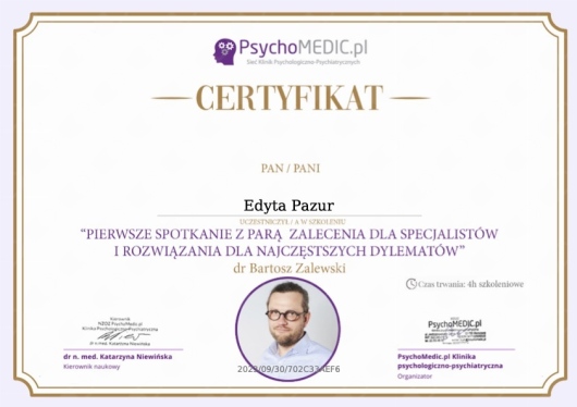 Bardzo polecamy terapię u Pani Edyty. Od pierwszego spotkania czuliśmy się wysłuchani i zaopiekowani. Panuje tam niezwykle ciepła i bezpieczna atmosfera, która pomaga otworzyć się na rozmowę. Pani Edyta jest niezwykle kompetentna, profesjonalna i pełna empatii. Pomogła nam spojrzeć na wiele rzeczy z innej perspektywy, a dzięki jej wskazówkom i ćwiczeniom możemy skutecznie pracować nad naszą relacją. Każda sesja daje nam spokój i poczucie, że jesteśmy na dobrej drodze. Jesteśmy ogromnie wdzięczni!