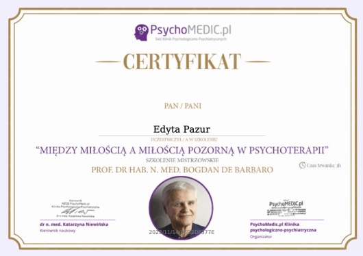 Jaki jest zakres porad oferowanych przez Edyta Pazur?Edyta Pazur to psychoterapeuta. Na podstawie swojego doświadczenia i wykształcenia Edyta Pazur oferuje usługi takie jak: konsultacja psychoterapeutyczna, psychoterapia indywidualna, konsultacja psychoterapeutyczna dla par, konsultacja psychoterapeutyczna dla par (pierwsza wizyta), konsultacja psychoterapeutyczna (pierwsza wizyta), konsultacja psychoterapeutyczna (kolejna wizyta), psychoterapia partnerska, terapia par, konsultacja online, psychoterapia online.