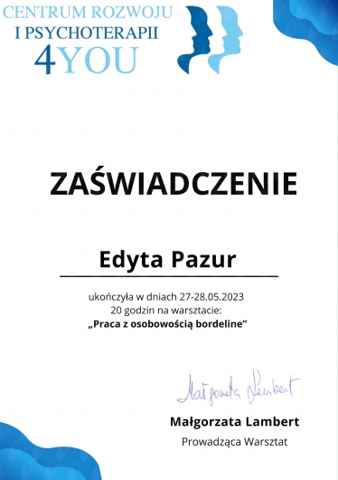 Pani Edyta jest wyjątkowym specjalistą w swoim fachu. Pełna zaangażowania oraz ciepła, wyróżnia się niesamowitą skutecznością oraz umiejętnością zadawania pytań w punkt. Terapia zawsze jest spójna, nigdy nie zostawiamy nierozwiązanych wątków, których nie udało nam się umówić podczas poprzedniej wizyty. Jestem niesamowicie wdzięczna za spotkanie takiego terapeuty. Wraz z Panią Edytą przechodzę niesamowitą przemianę, a wsparcie jej osoby w tym procesie jest nieocenione. Miałam okazję zapoznać się z różnymi terapeutami, jednak ze szczerego serca mogę polecić Panią Edytę, która zawsze znajdzie sposób na rozwiązanie, zrozumienie oraz zaakceptowanie tego, co dzieje się w środku.