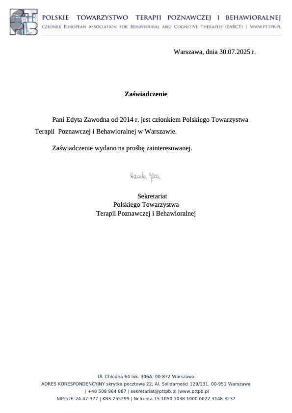 Trafiłam do Pani Edyty Zawodnej trochę przez przypadek, szukając w internecie psychoterapii w nurcie CBT. W Krakowie znalezienie doświadczonego terapeuty w tym podejściu było bardzo trudne – na wizytę trzeba było czekać wiele miesięcy.
