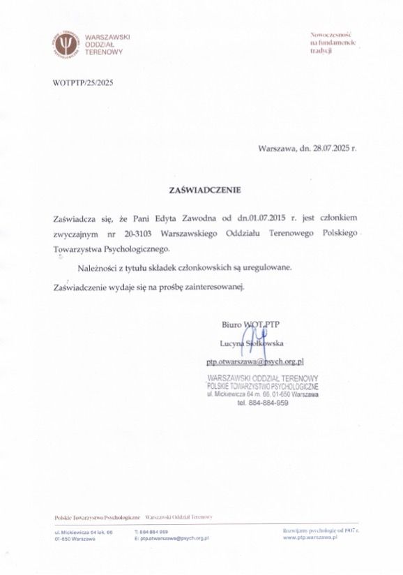 Pani Edyta stworzyła przestrzeń pełną ciepła i akceptacji, gdzie mogłam bez lęku mówić o swoich trudnościach. Każda rozmowa przynosiła mi ulgę, a jednocześnie dawała nowe narzędzia do radzenia sobie z emocjami. Stopniowo zaczęłam odzyskiwać równowagę, pewność siebie i spokój, za który dziś jestem ogromnie wdzięczna.