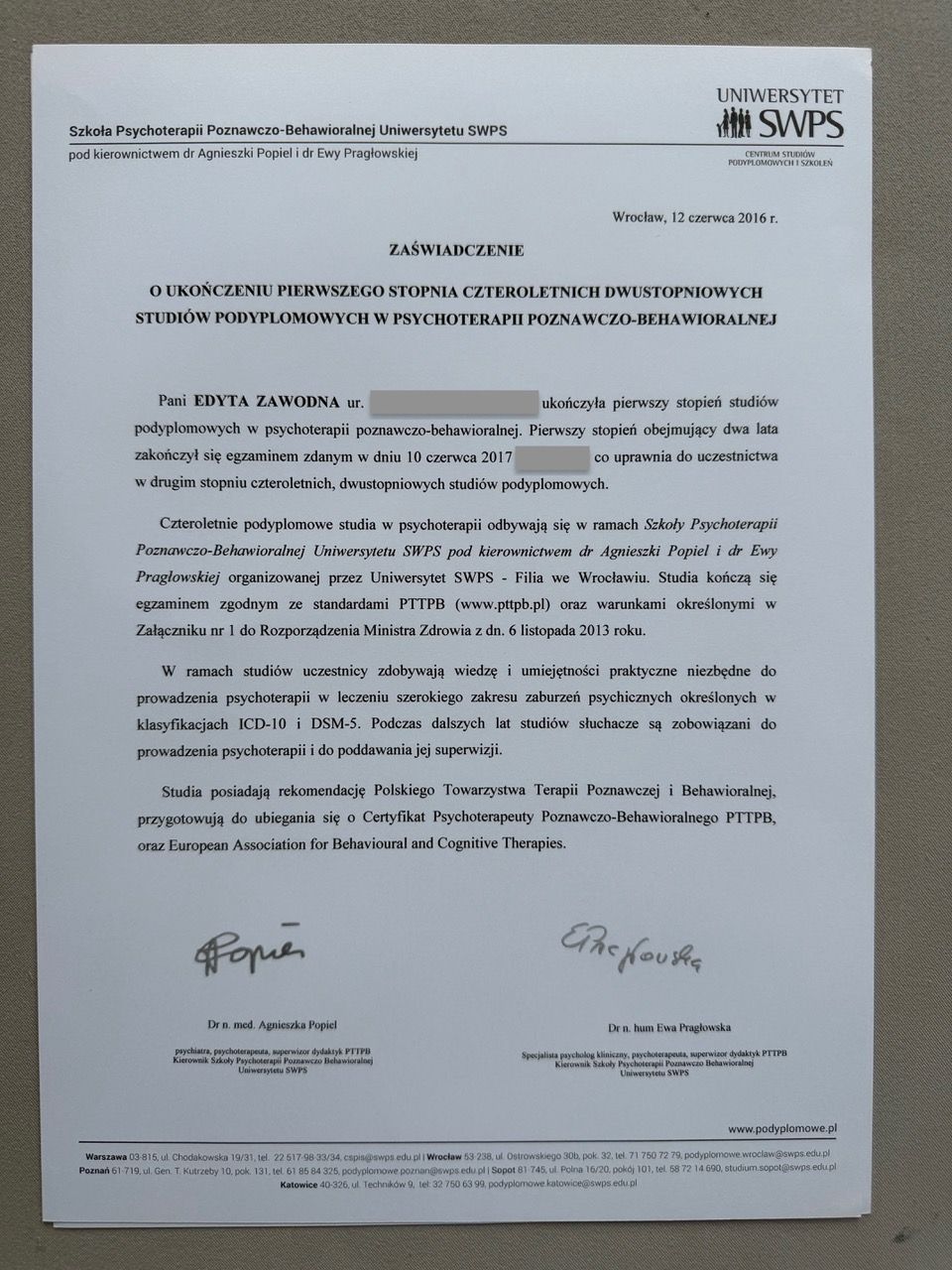 Dziękuję za zaufanie, z jakim powierzyła mi Pani tak ważny fragment swojej drogi podczas naszej wspólnej psychoterapii.