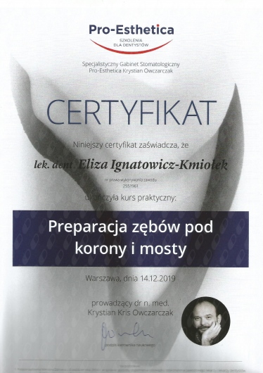 Jaki jest zakres porad oferowanych przez Eliza Ignatowicz-Kmiołek?Eliza Ignatowicz-Kmiołek to stomatolog, protetyk stomatologiczny, lekarz wykonujący zabiegi medycyny estetycznej. Na podstawie swojego doświadczenia i wykształcenia Eliza Ignatowicz-Kmiołek oferuje usługi takie jak: Stomatologia zachowawcza, badania stomatologiczne, stomatologia estetyczna, protezy, leczenie próchnicy, korony pełnoceramiczne, protezy szkieletowe, konsultacja protetyczna, odbudowa zębów, wkłady koronowo-korzeniowe.