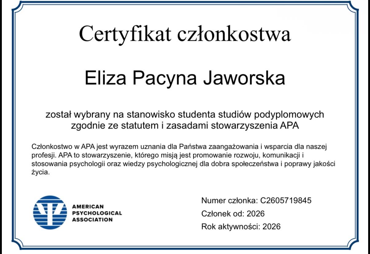 Bardzo dziękuję za tak życzliwą i szczegółową opinię. Cieszę się, że nasze spotkania okazały się pomocne i że materiały oraz zadania wspierają proces pracy między sesjami.
